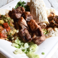 Spiedino di carne su pane Lavash con contorno di verdure cotte alla brace.